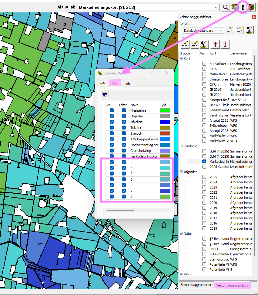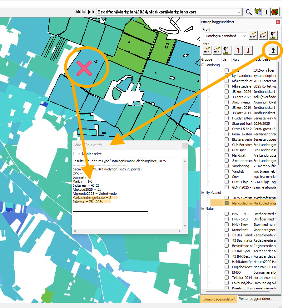 Åbn i-knappen (objektinfo) og klik på en enkelt mark for at få detaljerede markoplysninger frem