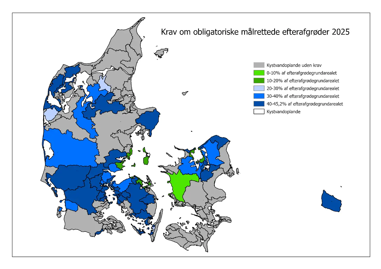 Den resterende indsats hentes ved et krav om obligatoriske målrettede efterafgrøder i de kystvandoplande, hvor der er et restindsatsbehov. Har du ikke udlagt målrettede efterafgrøder eller udlagt færre end det obligatoriske krav vil du blive mødt med en kvotereduktion i 2026, hvis ikke du finder en løsning.