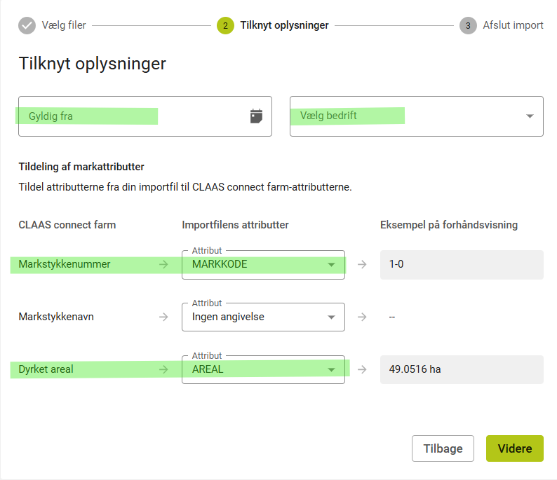 Vi udlæser følgende informationer fra dine marker, som du kan bruge i din import i Claas Connect