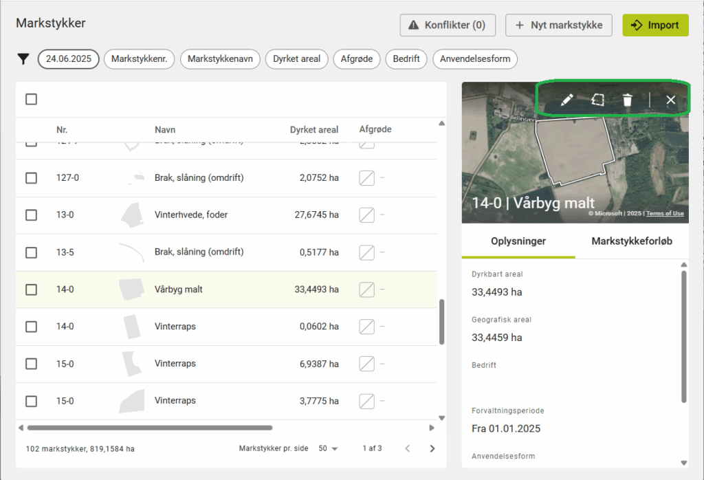 Du kan rette oplysninger ved at trykke på blyanten eller markgrænserne eller slette marken.