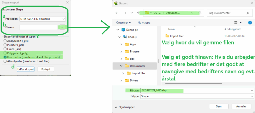Vælg en mappe, hvor du kan finde filerne igen. Og skift *.shp ud med BEDRIFT_2025.shp og tryk på gem