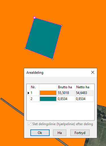 Programmet vil nu beregne areal på opståede delarealer. Resultatet vises i dialogen Arealdeling. Via denne