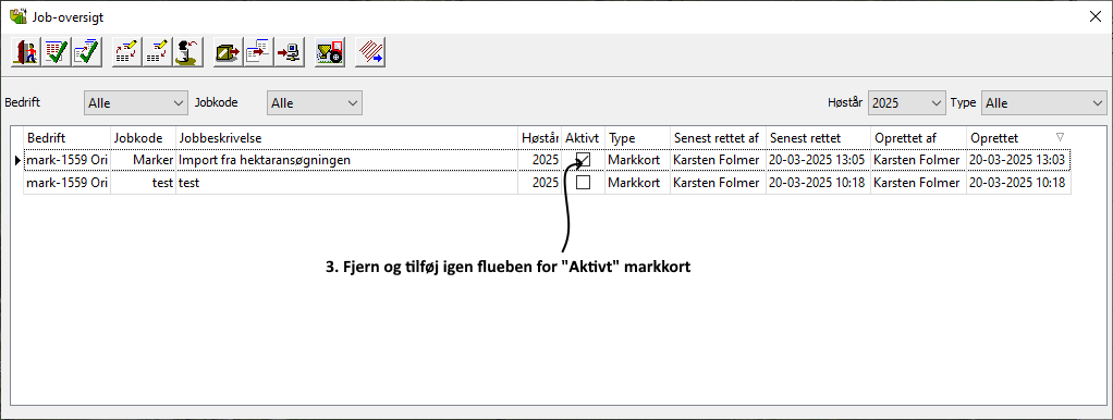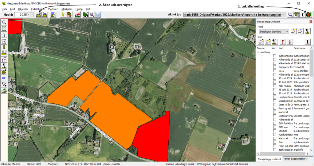 Mangler der nye biomassekort kan du provokere CropManager til at hente nye ved at åbne markkortet. lukke alle lag/markkort og vippe flueben for aktivt kort i job-oversigten. Nu skulle CropManager fremover hente nye biomassekort automatisk.